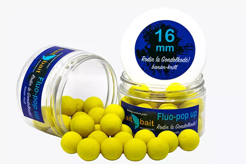 A Bait Bait Fluo Pop-Up bojlijaink nagyon élénk színekkel, erőteljes aromával, valamint hosszantartó lebegő képességgel rendelkeznek. Anyagukban extra mennyiségű étvágyfokozókat és aminókat tartalmaznak. A csalik csomagolás előtt is átesnek egy étvágyfokozó fürdőn, hogy minél aktívabban és minél frissebben várják, hogy bevessék Őket. Anyagösszetételük egyedülálló a magyar piacon, nagyon egyedi alapanyagok alkotják. Ezeket a csalikat volt a legnehezebb megalkotni, mivel itt is arra törekedtünk, hogy egy kimagasló minőségű csali kerüljön a horgászok kezébe. A fejlesztések alatt rengeteg keverési arányt kipróbáltunk, de itt is a tökéletességre törekedtünk, így sikerült ezeket a csalikat megalkotnunk. Ezen Pop-Upokat enyhén gumis állag, és szinte szétnyomhatatlan szerkezet jellemzi. A csalik szerkezete lehetővé teszi az utólagos plussz dippelést is. Ízesítés: Banán-krill-máj