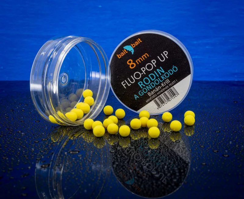 A Bait Bait Fluo Pop-Up bojlijaink nagyon élénk színekkel, erőteljes aromával, valamint hosszantartó lebegő képességgel rendelkeznek. Anyagukban extra mennyiségű étvágyfokozókat és aminókat tartalmaznak. A csalik csomagolás előtt is átesnek egy étvágyfokozó fürdőn, hogy minél aktívabban és minél frissebben várják, hogy bevessék Őket. Anyagösszetételük egyedülálló a magyar piacon, nagyon egyedi alapanyagok alkotják. Ezeket a csalikat volt a legnehezebb megalkotni, mivel itt is arra törekedtünk, hogy egy kimagasló minőségű csali kerüljön a horgászok kezébe. A fejlesztések alatt rengeteg keverési arányt kipróbáltunk, de itt is a tökéletességre törekedtünk, így sikerült ezeket a csalikat megalkotnunk. Ezen Pop-Upokat enyhén gumis állag, és szinte szétnyomhatatlan szerkezet jellemzi. A csalik szerkezete lehetővé teszi az utólagos plussz dippelést is.