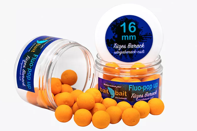 A Bait Bait Fluo Pop-Up bojlijaink nagyon élénk színekkel, erőteljes aromával, valamint hosszantartó lebegő képességgel rendelkeznek. Anyagukban extra mennyiségű étvágyfokozókat és aminókat tartalmaznak. A csalik csomagolás előtt is átesnek egy étvágyfokozó fürdőn, hogy minél aktívabban és minél frissebben várják, hogy bevessék Őket. Anyagösszetételük egyedülálló a magyar piacon, nagyon egyedi alapanyagok alkotják. Ezeket a csalikat volt a legnehezebb megalkotni, mivel itt is arra törekedtünk, hogy egy kimagasló minőségű csali kerüljön a horgászok kezébe. A fejlesztések alatt rengeteg keverési arányt kipróbáltunk, de itt is a tökéletességre törekedtünk, így sikerült ezeket a csalikat megalkotnunk. Ezen Pop-Upokat enyhén gumis állag, és szinte szétnyomhatatlan szerkezet jellemzi. A csalik szerkezete lehetővé teszi az utólagos plussz dippelést is. Ízesítés: Sárgabarack-chili