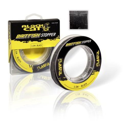 Csalihalakat, gilisztákat fixálhatunk a horog hegyén elhelyezett ellenálló, de mégis puha és a lehetőségekhez képest észrevehetetlen gumival. A Black Cat innovatív ajánlata az előre perforált, igen ellenálló gumiból készült Baitfish Stopper (15 x 15 mm) nagy tekercsen. Egyszerűen lehúzhatók az elosztóról és a perforációnál leválaszthatók. 1,50 méteres hosszon 100 darab bevetésre kész stopper található a csalik rögzítéséhez.