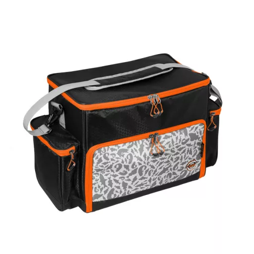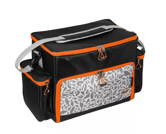 Minőségi narancssárga színű cipzárokkal rendelkezik. A cipzárok műanyag húzókkal vannak ellátva narancssárga zsinóron, amely a végén kiszélesedik, így könnyebben megfogható. A narancssárga kiegészítő elemek lehetővé teszik a horgásznak, hogy akár szürkületben is jól látható és könnyen észrevehető legyen.A táska szürke vállpánttal van ellátva, hogy tudja a vállán hordani. A táska könnyű de ellenálló fekete anyagból van varrva. A táska dizájn a mi egyedülálló szürke ATAK! terepminta ragadozóhal sziluettek díszítik.