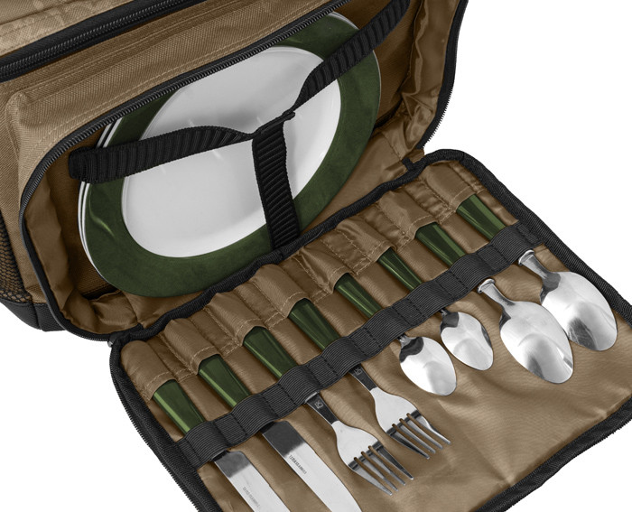A táska elején egy nagy zseb van, melyben két személyre étkészlet található. Az étkészlet tartalmaz két darab műanyag tányért, két kést, két villát, két kanalat és két kis kávés kanalat. Mostantól még több kényelmet élvezhet a vízparton, a párjával vagy egy jó baráttal!
