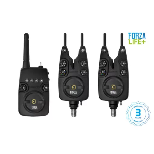 A FORZA Life+ egy vevőegységgel ellátott kapásjelző szett, amiben az elektronikai fejlesztéseknek és a vevőkészülékbe kerülő elemek típusának megváltoztatásának köszönhetően lényegesen nagyobb elem élettartamot sikerült elérnünk a teljes szett viszonylatában.A Delphin FORZA Life+egy olyan kapásjelző szett, amely minden körülmények között megbízható fény-, hang- vagy rezgő jelzést ad. A kapásjelző és a vevőegység teste fekete szilárd ABS műanyagból készült, amely garantálja a mechanikai sérülésekkel szembeni ellenállást. A hosszú élettartamhoz hozzájáruló szempont az abszolút vízállóság is. Minden jelzőkészülék a billenőkapcsoló segítségével nappali vagy éjszakai üzemmódba kapcsolható. Éjszakai üzemmód esetén a helyzetjelző LED kigyullad, ennek köszönhetően mindig áttekintést kap a botok elhelyezéséről. A kapásjelzők szeléskörű beállítással szolgálnak. A jelzőhang (T kapcsoló) és érzékenység 1-9cm tartományban (S kapcsoló) igény szerint öt lehetőség közül választható. Ejtős kapás esetén más hangtónussal jelez. A hangerő öt különböző szinten is beállítható, a 0 szint néma üzemmódot jelent. A FORZA Life+ készlet jelzőeszközeinek vitathatatlan előnye az a lehetőség, hogy a jelző LED dióda 7. színéből választhatunk. Mindenki kiválasztja a kedvencét, és ha változást szeretne, egyszerűen válasszon egy másik színt a "C (szín)" forgókapcsolóval, és nem kell új jelzőt vásárolnia. Alul van egy bemenet 2,5 mm-es jack csatlakozóhoz a világító kapásjelző csatlakoztatásához. Ezenkívül minden jelző rendelkezik menettel a sang gear rögzítésére, amelyek szintén a csomag részét képezik. A kapásjelzőkhöz ezenkívül kap szállító takarókat a vevőhöz pedig asztaltartót!Magát a vevőegységet megbízható jelvétel jellemzi még benőtt terepen is, hatótávolsága pedig optimális körülmények között akár 160 m is lehet. 4. színes LED-diódája van, amelyek színét az utasításoknak megfelelően a "P" gombbal lehet kiválasztani. 5 különböző hang és hangerő közül választhat. Amikor a kart jobbra mozgatja, a rezgés mód aktiválódik.A vevő az összes beállított paramétert a memóriában tárolja. A szettet 9 V-os elemek működtetik, és ha lemerülnek, a jelzők és a vevő rövid hangjelzéssel figyelmeztet. Értékelni fogja a vevőhöz tartozó asztaltartót, valamint a jelzővédőket is, amelyeket a csomagban is megtalál.Ennek a szettnek a kofferjába 3+1 összeállítású jelző fér el (3drb jelző és egy vevő).A FORZA Life+ szett párosítható a Lightcontact lámpával.Technische Parameter:Szett 2+1 tartalmazza:- 2x Kapásjelző- 1x Vevő egység- 1x Szállító koffer- 1x Asztaltartó a vevő egységre /HOLD myFORZA- 2x Snag gears- 2x Kapásjelző védő tokVEVŐ / funkciók:- 5 hangerőszint (kapcsoló V, beleértve a néma üzemmódot) - 5 különböző hangszín (kapcsoló T) - Vibrációs mód (billenőkapcsoló - jobb helyzetben) - 4 színű jelző LED dióda - A beállításokat megőrzi a memóriájában - Billenőkapcsoló BEKAPCSOLVA/KIKAPCSOLVA/VIBRÁCIÓS MÓD - Memória dióda - kapástól számított 20 másodpercig világít - Ellem merülését jelzi rövid hangjelzéssel - Hatótávolság teszt mód - Hatótávolság 160m terepviszonyoktól függően - Vevő asztali tartója / HOLD myFORZA- Elem 3xAAAKAPÁSJELZŐ / funkciók:- Vízhatlan - 5 hangerőszint (kapcsoló V, beleértve a néma üzemmódot) - 5 különböző hangszín (kapcsoló T) - 5 érzékenységi szint (kapcsoló S) - 7 választható LED dióda szín (kapcsoló C) - Billenőkapcsoló NAPPALI MÓD/KIKAPCSOLVA/ÉJSZAKAI MÓD - A beállításokat megőrzi a memóriájában - Levehető snag gear - Húzásra, ejtésre más hangszín - Memória dióda - kapástól számított 20 másodpercig világít - Ellem merülését jelzi rövid hangjelzéssel - Pozíció jelző éjszakai dióda - Csatlakozó 2.5mm jack - Szállításkori védő - Elem 1x9V2+1-es készlet: mindig kék és piros fényű jelzőt tartalmaz.3+1-es készlet: mindig kék, piros és zöld fényű jelzőt tartalmaz.4+1-es készlet: mindig kék, piros, zöld és sárga fényű jelzőt tartalmaz.