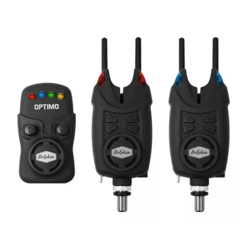 A szlovák Delphin Optimo 9V kapásjelző és ellenőrzött,érzékeny vevő szettje 2016 egyik újdonsága.A neve is mutatja,hogy 9V elemmel működik,mely garantálja tartósságát és a szett legnagyobb előnyei közé tartozik.Magas szintű gyártási technológiával készültek a jelzők,rossz időjárásnak és esőnek ellenállnak.Egyszerűen és könnyen használhatók,a hangerő(lehetőség van a néma üzemmódra),és a hangszín szabályozható,valamint a kapás érzékenysége,melyet a horgászok értékelni fognak.A szett lehetőséget nyújt még mind hang-mind fény alapú jelzésre 200 méteren belül.A világítós swingerek részére tartalmaz egy csatlakoztatót is. A szett tartalma:vevő,kapásjelző,swinger és Snag Gear, a megvett kapásjelzők számával megegyező számban.Az alap szetthez(2+1),kemény hordozható tartó jár,mely bővíthető 4+1-re.A Snag Gear rúdjai egyszerűen egyszerűen rácsavarhatóak a kapásjelző hátsó részén kialakított menetekre,így minden körülmények között az állványon fogja tartani a botjainkat.A termék 3 éves garanciával rendelkezik,ami azt is mutatja,hogy minősége kiváló.Ennek a szettnek a kofferjába 3+1 összeállítású jelző fér el (3drb jelző és egy vevő).2+1-es készlet: mindig kék és piros fényű jelzőt tartalmaz.3+1-es készlet: mindig kék, piros és zöld fényű jelzőt tartalmaz.4+1-es készlet: mindig kék, piros, zöld és sárga fényű jelzőt tartalmaz.