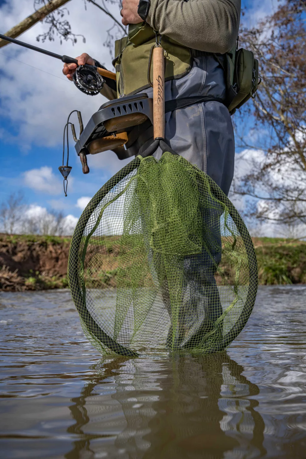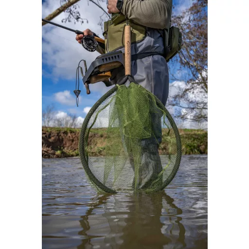 Kifejezetten a vízbol horgászók számára készített gázlómeríto. Halkímélo latex gumírozott háló extrán lebego EVA kerettel. A kemény parafa nyélben egy beépített mágnes található kiegészítve egy kihúzható gumis biztonsági zsinórral. Ez a dupla rögzítés garantálja hogy ha horgászat közben a vízbe kell dobni a szákot azt a sodrás biztosan nem viszi magával. A keret mérete: 66cm/26”. A nyél hossza: 30cm. A háló mélysége 70cm a megszákolt hal biztonságos megtartásáért.