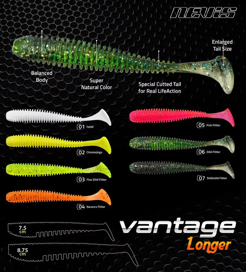 Speciális puha silicon anyaga nagy szakitószilárdságú. Még a lassú vontatásnál is rendkívül intenzív farokmozgású. Többfajta pergetési technikához alkalmazható!
