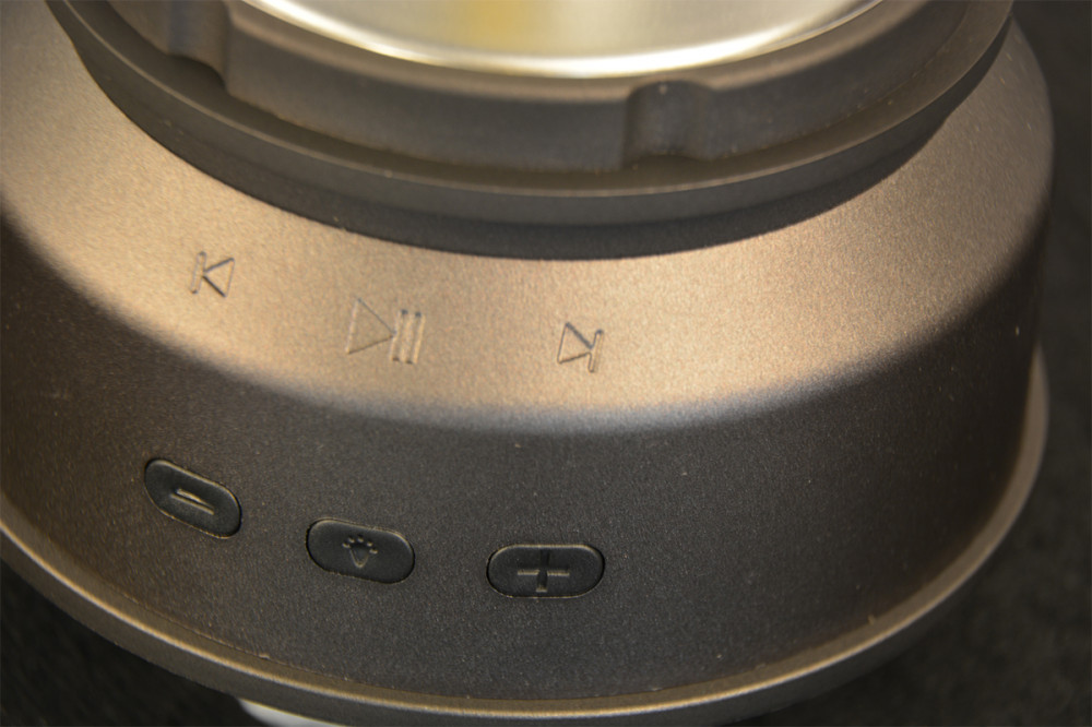 - A talprészen helyezkednek el a kezelőgombok: egyik oldalon a két hangerőszabályzó gomb, melyekkel a zeneszámok között is válthatunk, illetve a LED bekapcsológombja is itt látható.