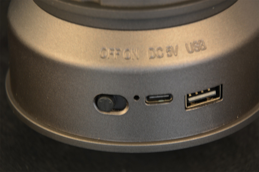 - A túloldalt a főkapcsoló, a töltésjelző fény, az USB-C töltőport és egy USB bemenet látható, melyről akár a merülőben lévő telefonunkat is feltölthetjük.