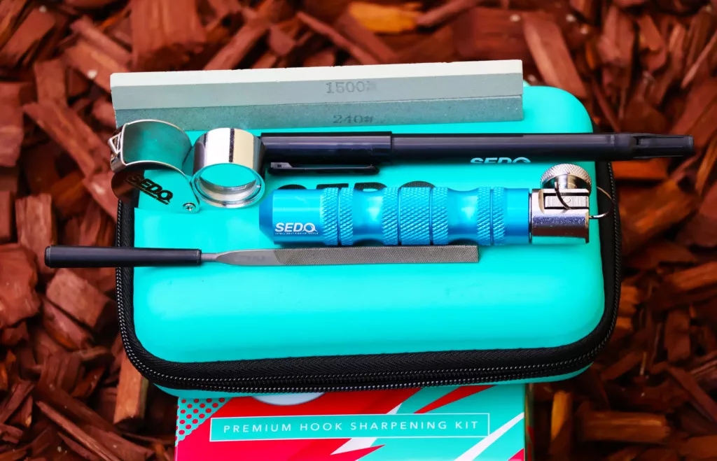A horogsatu csúszásmentes markolatával biztos fogást ad a horog élezése közben