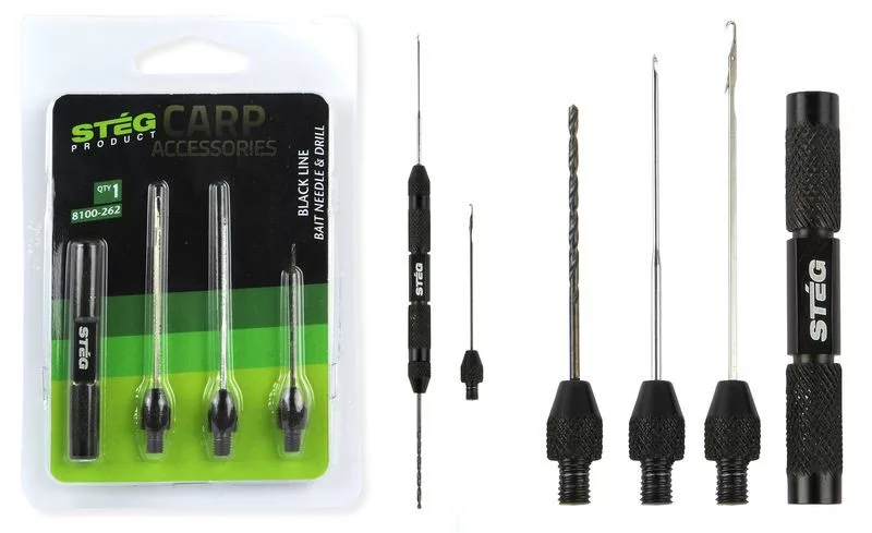A fémből készült nyélhez csavarozható csalifúró (4 cm), kemény magok, bojlik lyukasztásához, kapcsos fűzőtű (5,5 cm) a puha, vagy előfúrt csalikhoz, szerelékekhez. Vagy kapocs nélküli fűzőtű (5 cm), amellyel bojlikat, pelleteket, főtt magokat fűzhetünk fel a hajszálelőkére.