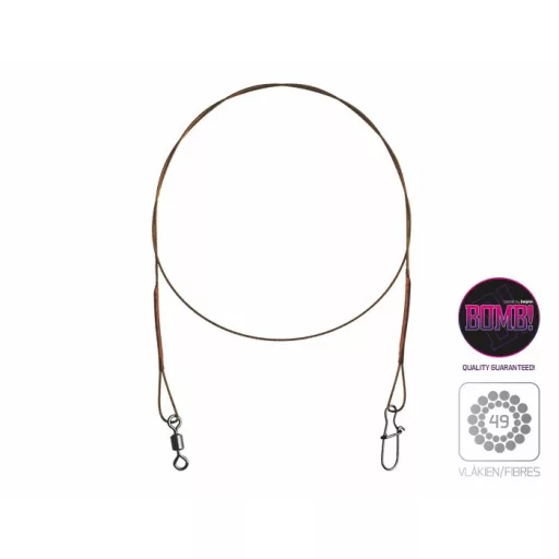 A BOMB! pergető acélhuzal a Delphintől, mely hihetetlen de 49 rozsdamentes szálból van fonva (megjelölése 7x7). Ez a huzal speciális a lágyságával és a rendíthetetlen ellenálló képességével az éles fogak és akadályokkal szemben. A tulajdonságainak köszönhetően bármilyen tevékenység könnyű és kellemes. Ráadásnak a tulajdonságainak köszönhetően lehetővé teszi a legóvatosabb ragadozó halak csalival való becserkelését. A BOMB! huzal egyik végén forgó a másik végén kapocs van, melyek erős font csomóval csatlakoznak. Minden csomagolásban 2 darab szerelék található. A forgók és kapcsok nagysága a huzalhoz igazodik: - 15cm/5kg- obratlík #14, karabínka #000 - 20cm/7kg- obratlík #12, karabínka #00 - 30cm/9kg- forgó # 8, kapocs # 0 - 35cm/11kg- forgó # 6, kapocs # 1 - 40cm/14kg-forgó # 5, kapocs # 2